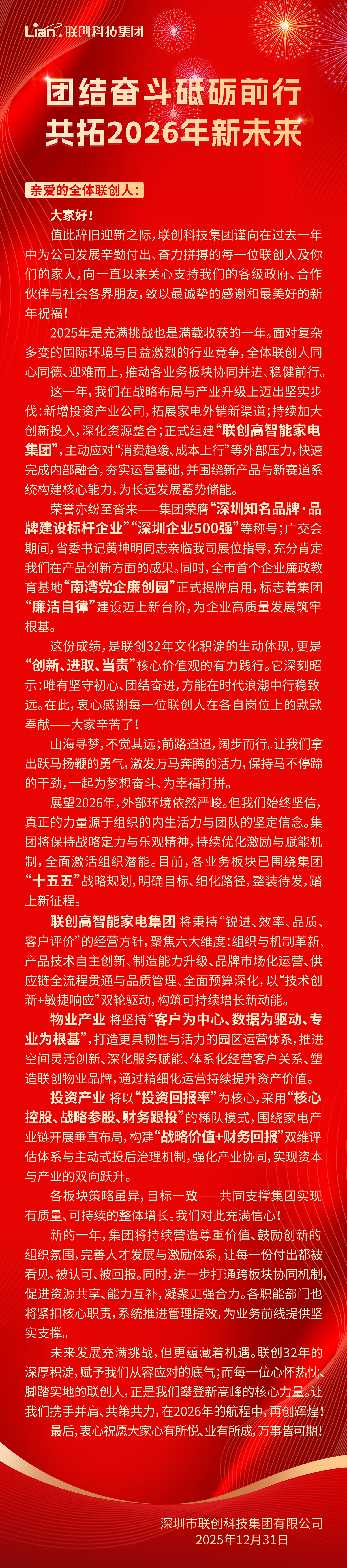 團(tuán)結(jié)奮斗增效率 銳進(jìn)創(chuàng)新拓市場(chǎng)——聯(lián)創(chuàng)科技集團(tuán)2025年總結(jié)表彰暨2026年工作部署大會(huì)圓滿召開